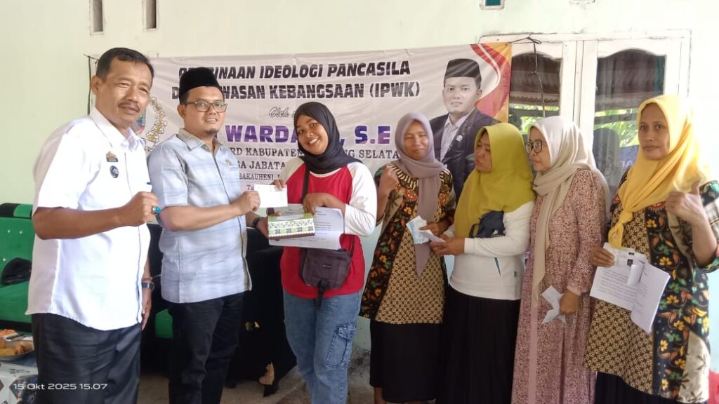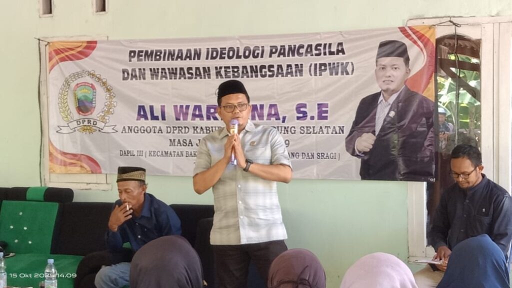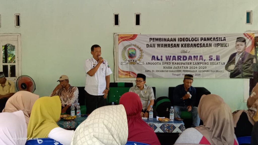 Itulah yang disampaikan anggota Dewan Perwakilan Rakyat Daerah (DPRD) Lampung Selatan (Lamsel) Ali Wardana, S.E., ketika menghelat pembinaan Ideologi Pancasila dan Wawasan Kebangsaan (IPWK) di Dusun Sukarame, Desa Bakauheni, Kecamatan Bakauheni, Kabupaten Lampung Selatan (Lamsel), pada Rabu (15/10/2025).