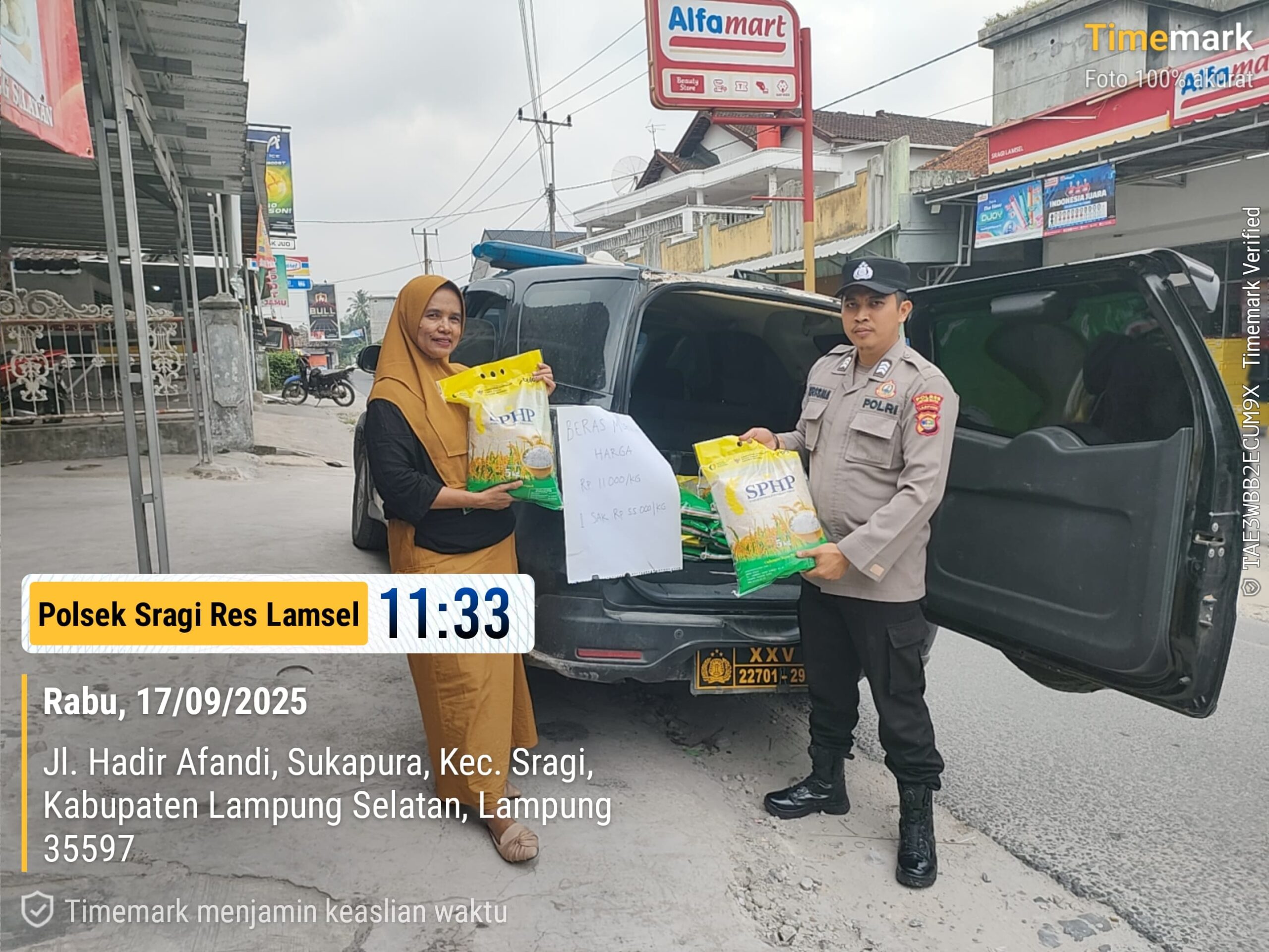 “Hari ini, Personil Polsek Sragi melakukan Patroli Hunting dan penjualan beras Stabilisasi Pasokan dan Harga Pangan (SPHP) dalam rangka Gerakan Pangan Murah di depan Pasar Belangah Desa Sukapura Kecamatan Sragi Kabupaten Lampung Selatan,” ucapnya.