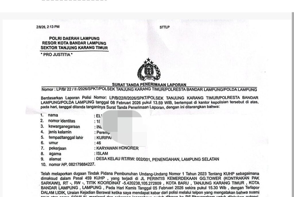 Laporan tersebut teregister dengan nomor LP/B/22/II/2026/SPKT/POLSEK TANJUNG KARANG TIMUR POLRESTA BANDAR LAMPUNG/POLDA LAMPUNG, tertanggal Minggu (8/2/2026).
