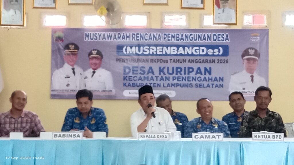 Kali ini Pemerintah Desa (Pemdes) Kuripan, Kecamatan Penengahan, Kabupaten Lampung Selatan (Lamsel) menggelar Musrenbangdes untuk menyepakati dan menyusun RKPDes 2026, yang dipusatkan di Balai Desa setempat, pada Rabu (17/9/2025).