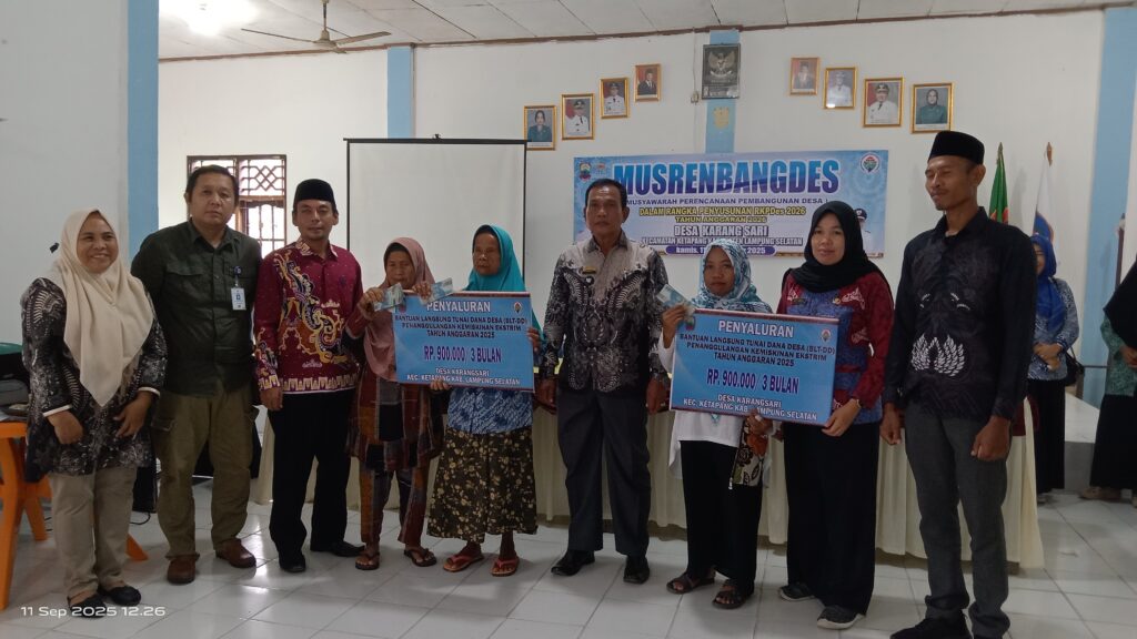 Pemerintah Desa (Pemdes) Karang Sari, Kecamatan Ketapang, Kabupaten Lampung Selatan (Lamsel) menggelar Musyawarah Perencanaan Pembangunan Desa (Musrenbangdes) dalam rangka membahas dan penyusunan rancangan RKP Desa Tahun Anggaran (TA) 2026, serta penyaluran Bantuan Langsung Tunai Dana Desa (BLT-DD) kemiskinan ekstrim periode Juli, Agustus dan September kepada 10 Keluarga Penerima Manfaat (KPM).