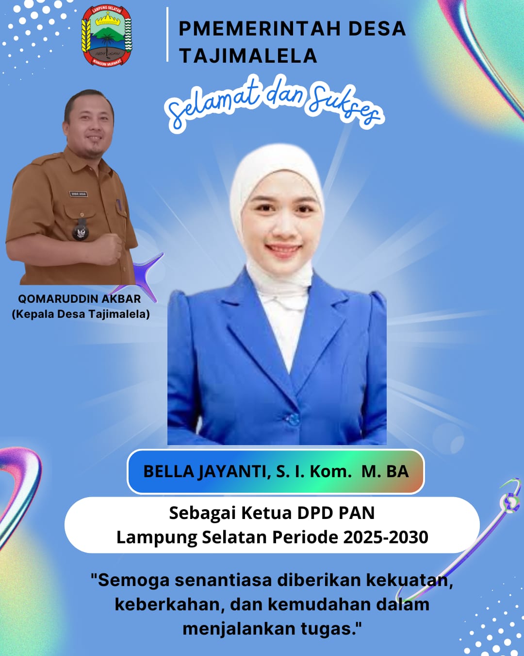 Kepada Desa Tajimalela, Qomaruddin Akbar mengungkapkan, “Kami atas nama Pemerintah Desa Tajimalela mengucapkan selamat dan sukses atas dikukuhkannya ibu Bella Jayanti, S.I.Kom., M.BA, sebagai Ketua DPD PAN Lampung Selatan periode 2025-2030,” ucapnya.