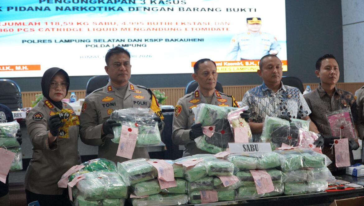 Polres Lampung Selatan Ungkap 3 Kasus Narkotika, Sita 118,59 Kg Sabu dan Selamatkan 479.857 Jiwa