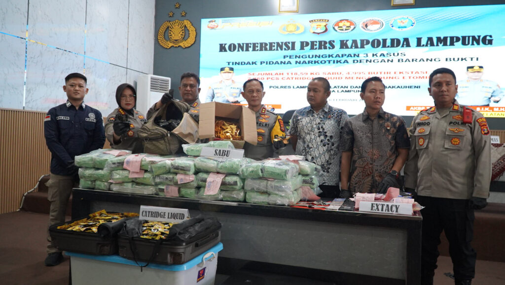 Dalam keterangannya, Kapolda menegaskan total barang bukti yang disita mencapai 118,59 kilogram sabu, 4.995 butir ekstasi, serta 2.860 cartridge liquid mengandung etomidate dengan nilai ekonomis sekitar Rp131,43 miliar dan potensi penyelamatan 479.857 jiwa dari penyalahgunaan narkotika.