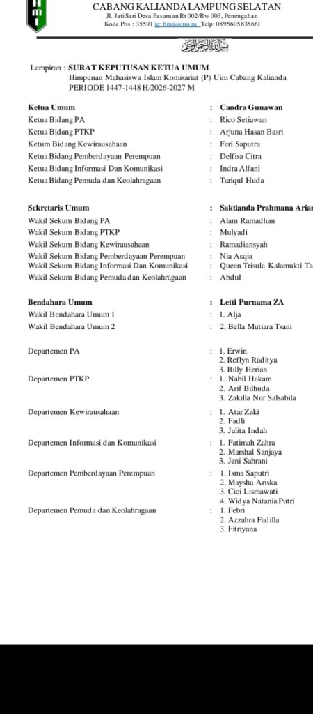 “‎Akhir kata, saya mengucapkan selamat mengemban amanah kepada seluruh pengurus. Semoga Allah SWT senantiasa memberikan kekuatan, keistiqamahan, dan keberkahan dalam setiap langkah perjuangan kita di Himpunan Mahasiswa Islam.” Tandasnya.