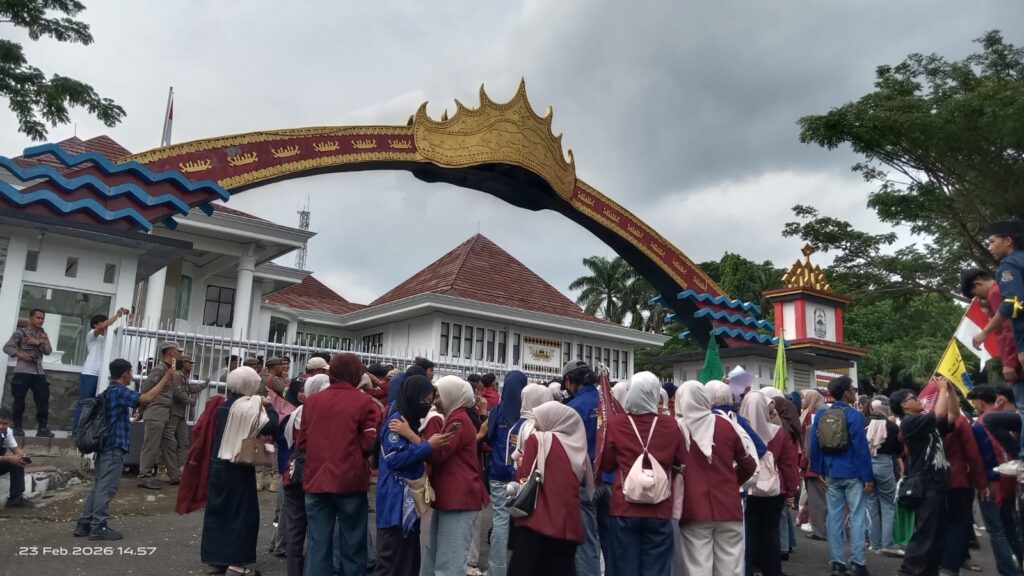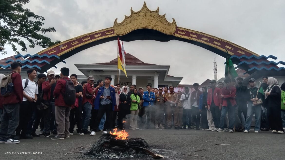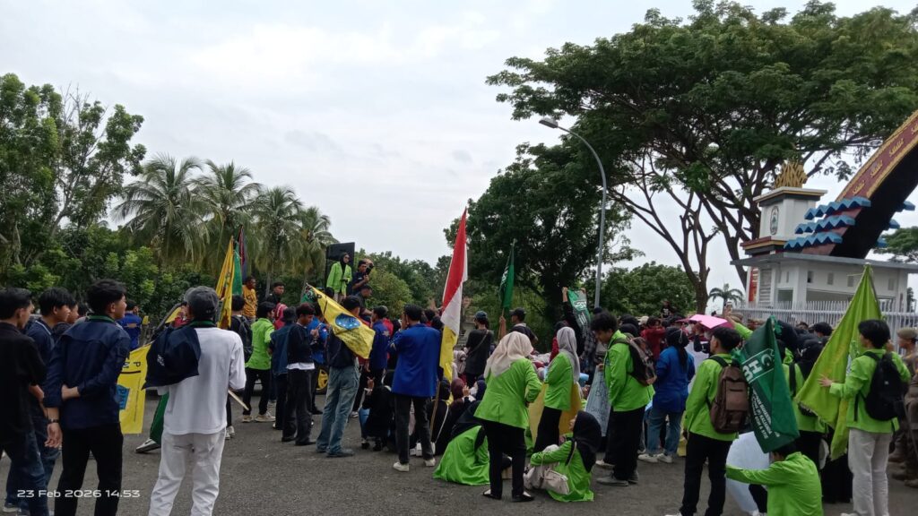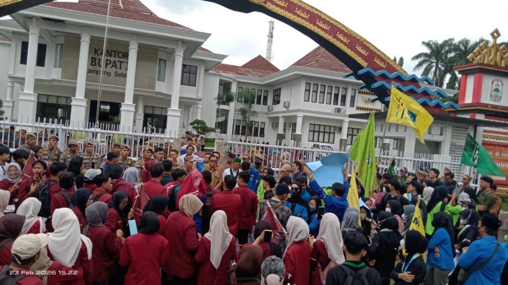 Setahun Egi-Syaiful menjabat Bupati Lampung Selatan (Lamsel), ratusan mahasiswa yang tergabung dalam Aliansi Cipayung Plus dan Badan Eksekutif Mahasiswa (BEM) se-Lampung Selatan berunjuk rasa di depan Kantor Bupati setempat, pada Senin (23/2/2026).