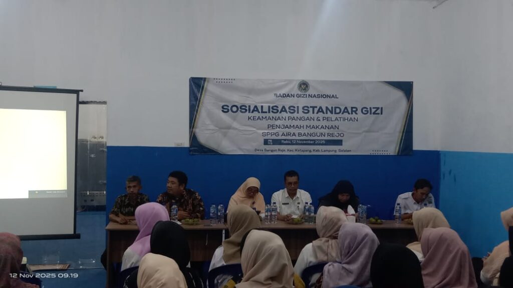 Guna untuk menjamin program pemerintah pusat, Makan Bergizi Gratis (MBG) makanan yang disajikan aman, bersih, higienis, dan bergizi, Satuan Pelayanan Pemenuhan Gizi (SPPG) Aira Bangun Rejo, Kecamatan Ketapang, Kabupaten Lampung Selatan (Lamsel) menggelar sosialisasi standar gizi keamanan pangan dan pelatihan penjamah makanan, pada Rabu (12/11/2025).